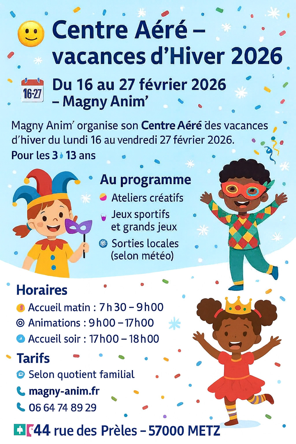 Inscriptions et renseignementsMagny’Anim organise son Centre Aéré des vacances d’hiver.