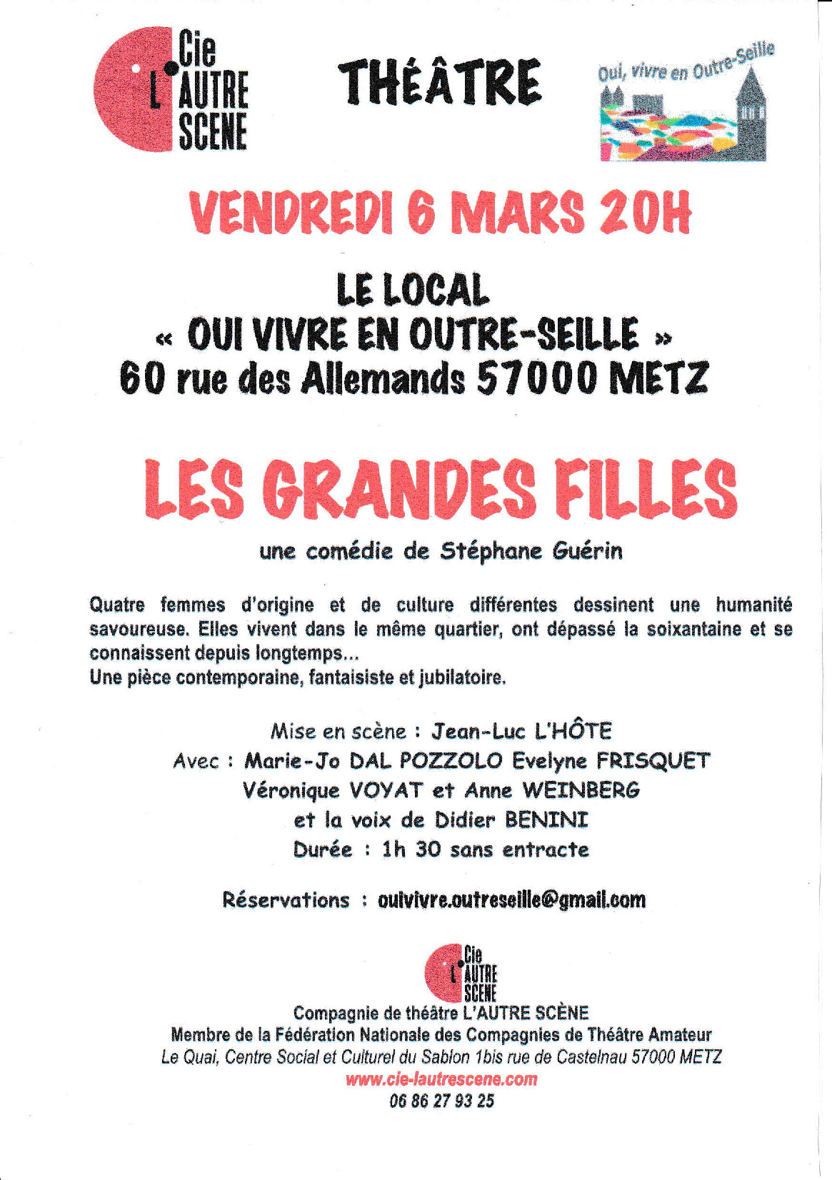 Durée : 1h30 sans entracteL'association "Oui, Vivre en Outre-Seille" est ravie d'accueillir la compagnie "L'Autre Scène" pour une représentation de la pièce "Les grandes filles" le vendredi 6 mars à 20h.