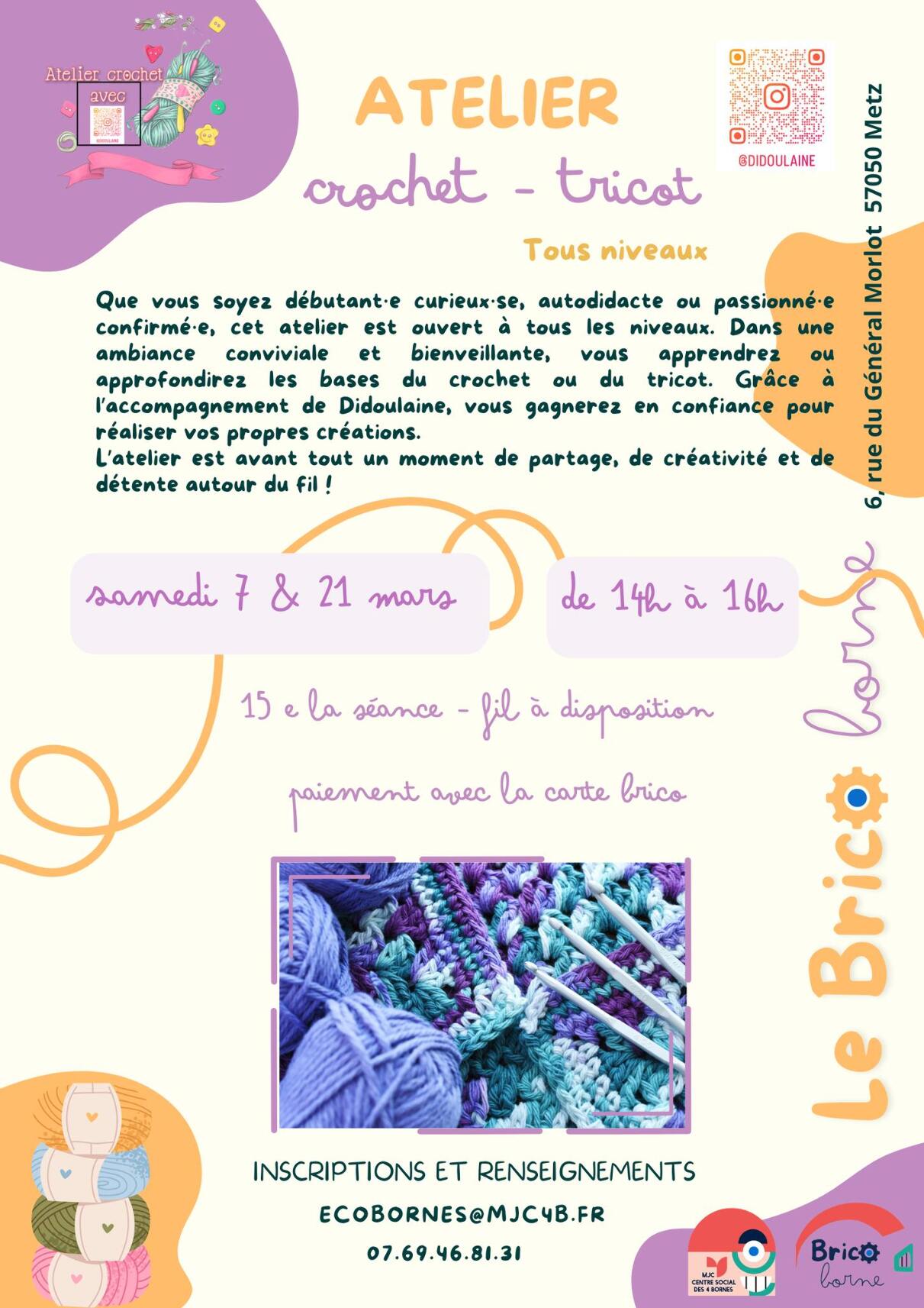 Que vous n’ayez jamais touché une pelote de laine ou que vous ayez déjà essayé sans succès, vous découvrirez ici les bases du tricot et du crochet dans une ambiance conviviale, détendue et bienveillante.