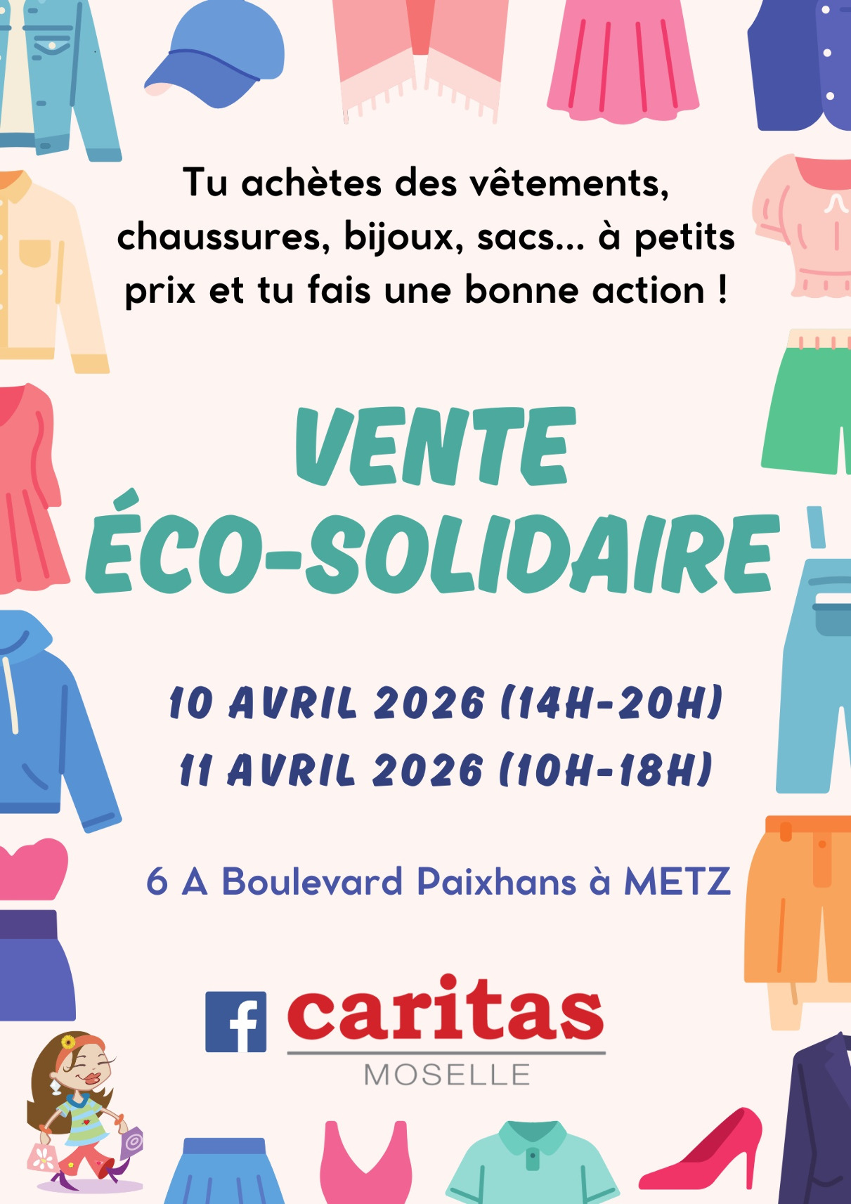 Caritas Moselle organisera une vente éco-solidaire, ouverte à tous, le vendredi 10 avril 2026, de 14h à 20h, et le samedi 11 avril 2026, de 10h à 18h, dans ses locaux situés au 6 A boulevard Paixhans à Metz.
