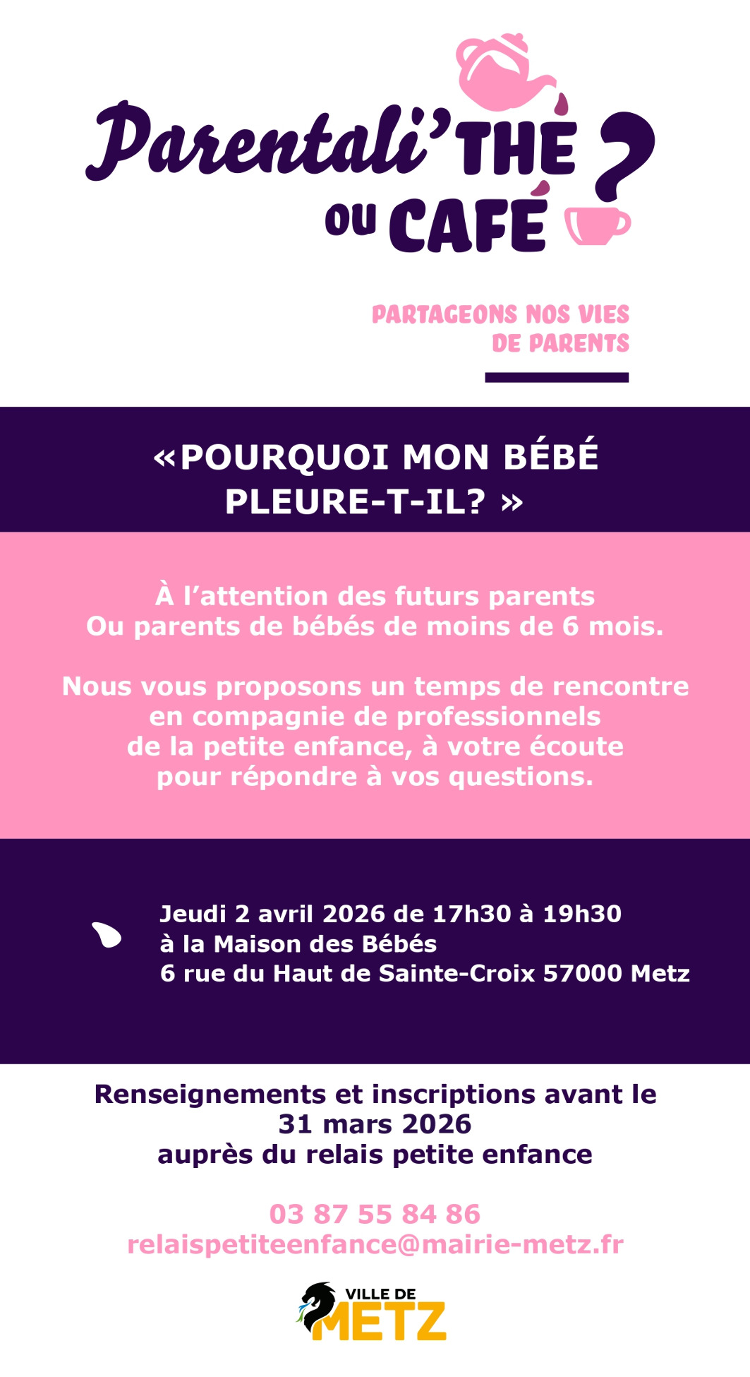 Inscriptions et renseignements auprès du Relais Petite Enfance : relaispetiteenfance@mairie-metz.fr / 03 87 55 84 86Le Relais Petite Enfance vous invite à un temps d'échange, animé par deux infirmières puéricultrices de la Ville de Metz, autour des pleurs de bébé.