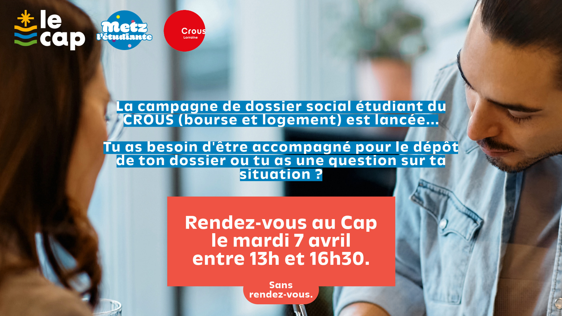 La campagne de dossier social étudiant du CROUS est lancée (bourse et logement) jusqu'au 31 mai. Tu as besoin d'être accompagné au dépôt de ton dossier ou tu as une question sur ta situation ? C'est l'occasion d'en échanger directement avec le CROUS Lorraine.