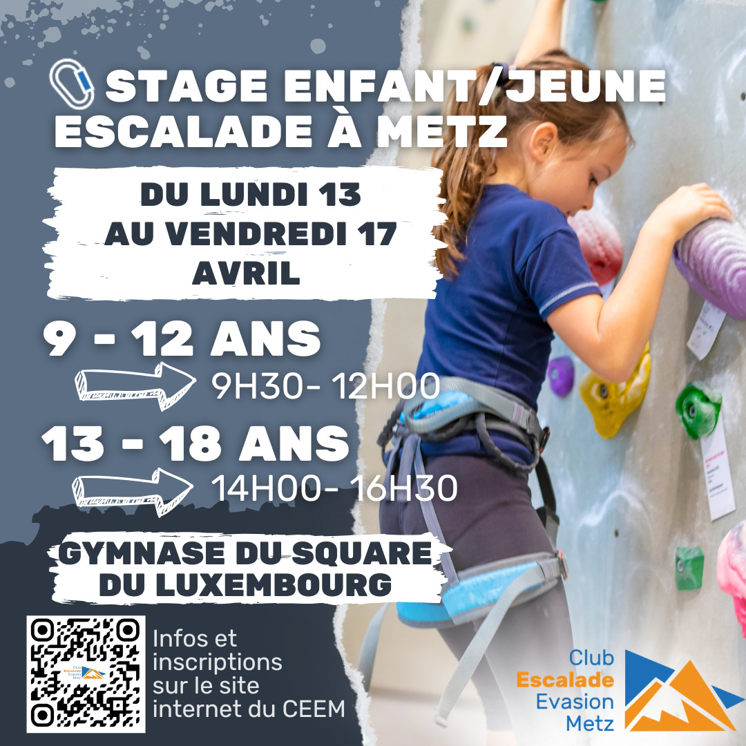 Nous vous proposons un stage d'escalade ouvert à tous au gymnase du square du Luxembourg pour les enfants de 9 à 12 ans et les ados de 13 à 18 ans. Un stage de découverte ou d'approfondissement à l'escalade encadré par un moniteur diplômé et passionné.