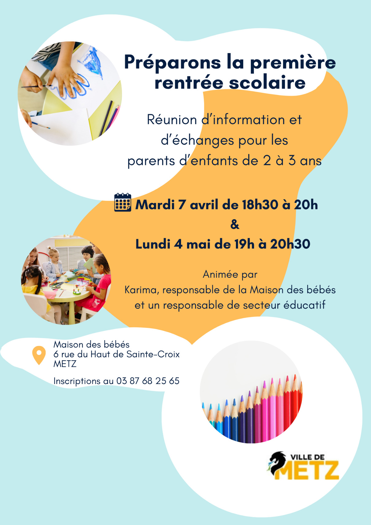 Les familles scolarisées hors de Metz peuvent assister à cette réunion qui ne se limite pas à donner les modalités d’inscriptions à Metz mais bien d’accompagner la première scolarisation et répondre aux questions des familles (déroulement d’une journée, rythmes scolaires, accompagner l’autonomie, la propreté…).