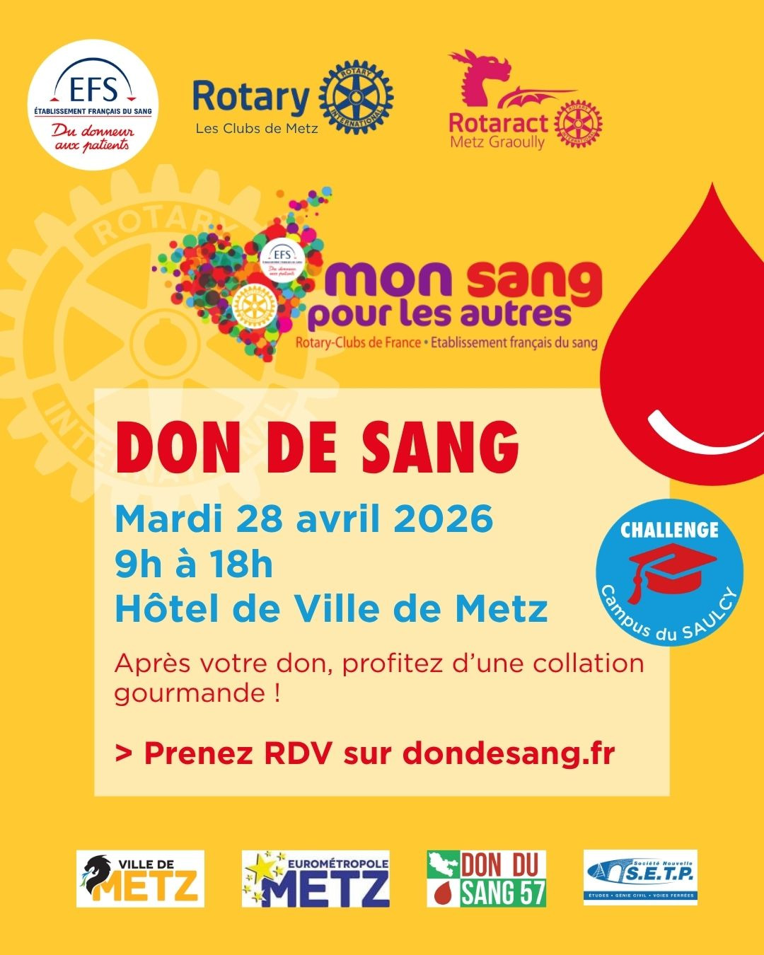 Programmer votre donUne grande collecte de sang inédite et festive Mon Sang Pour Les Autres se déroulera le mardi 28 avril 2026 dans les Salons de l’Hôtel de Ville de Metz de 9h00 à 18h00.