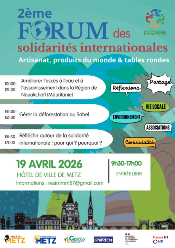 Le RESIMMM, la Ville de Metz, l'Eurométropole et Gescod organisent la 2e édition du Forum des Solidarités Internationales, un rendez-vous gratuit et ouvert à tous pour découvrir les initiatives locales et internationales en faveur d'un monde plus solidaire.