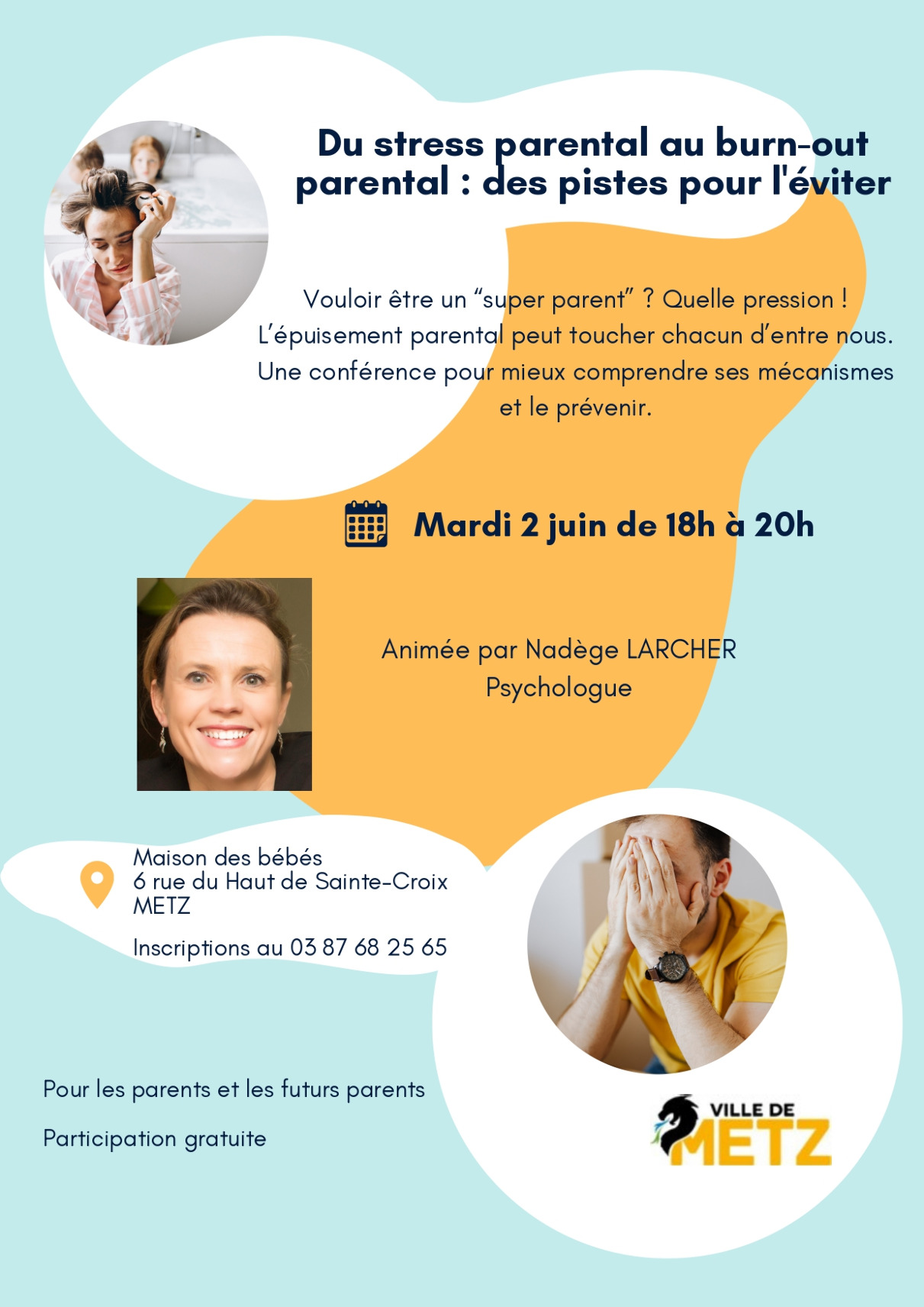 Cette conférence sera animée par Nadège Larcher, psychologue spécialisée dans le développement de l’enfant et la prévention de l’épuisement parental.