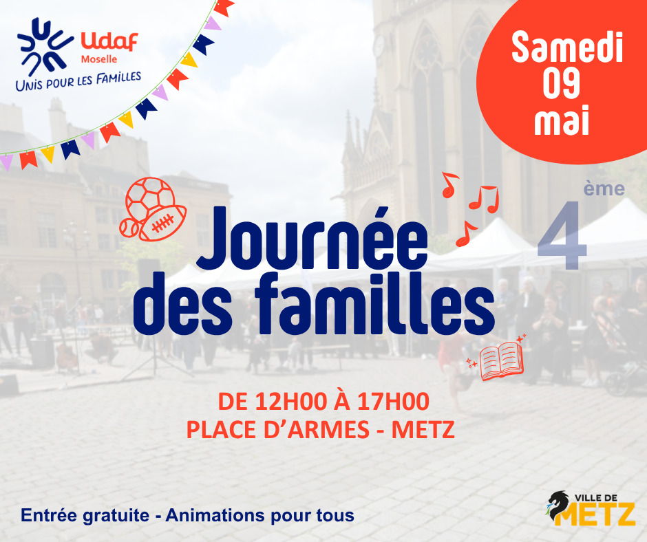 La Journée des Familles 2026, organisée par l’UDAF de la Moselle, se tiendra le samedi 9 mai 2026 de 12h à 17h, sur la Place d’Armes à Metz.