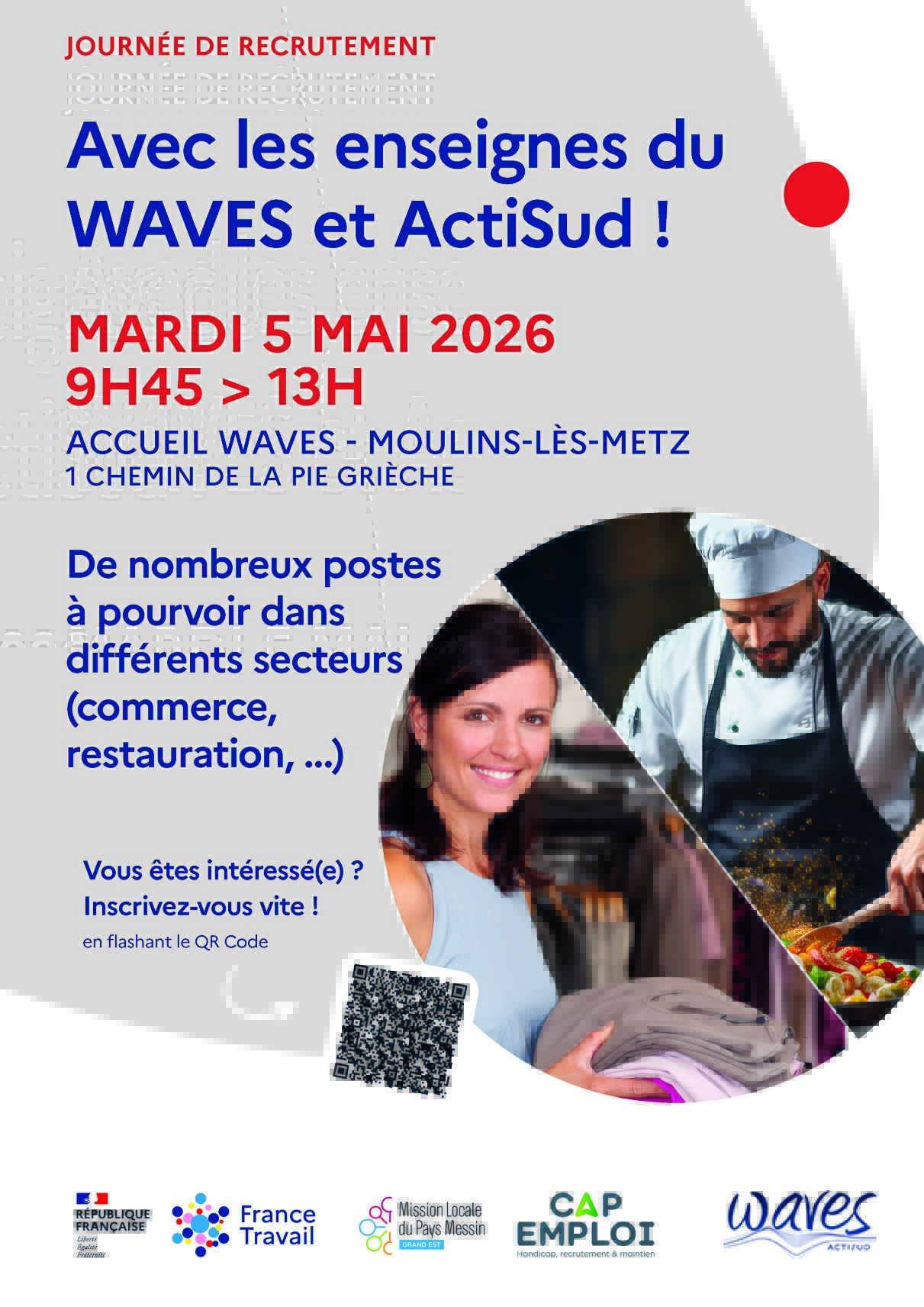 Merci de vous présenter au stand France Emploi devant l'accueil de WAVES (1 chemin de la Pie Grièche, Moulins-les-Metz) pour une présentation des postes et enseignes. Merci de vous munir de plusieurs CV.