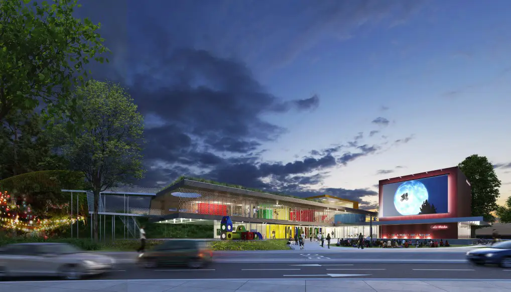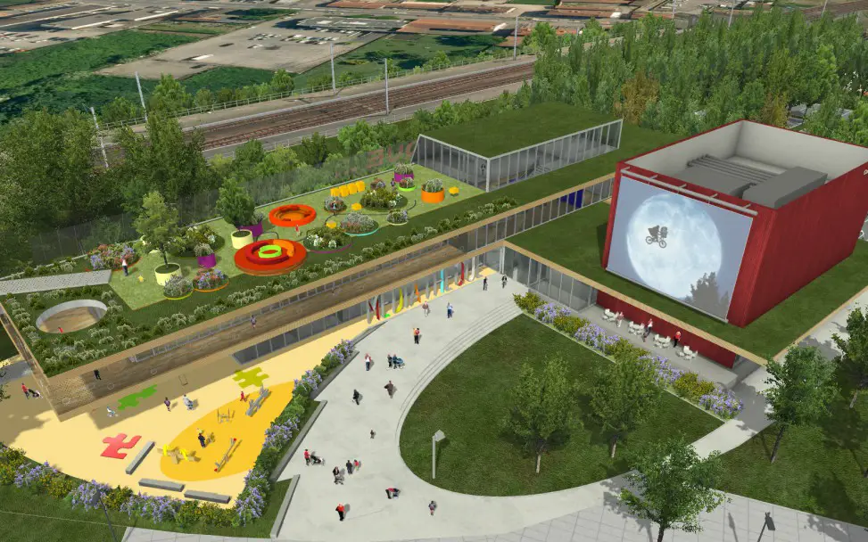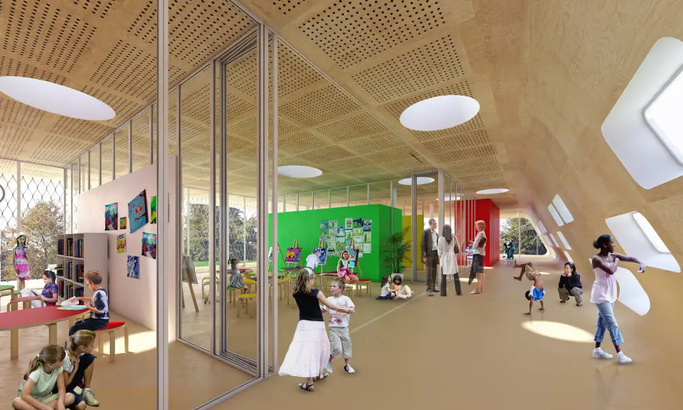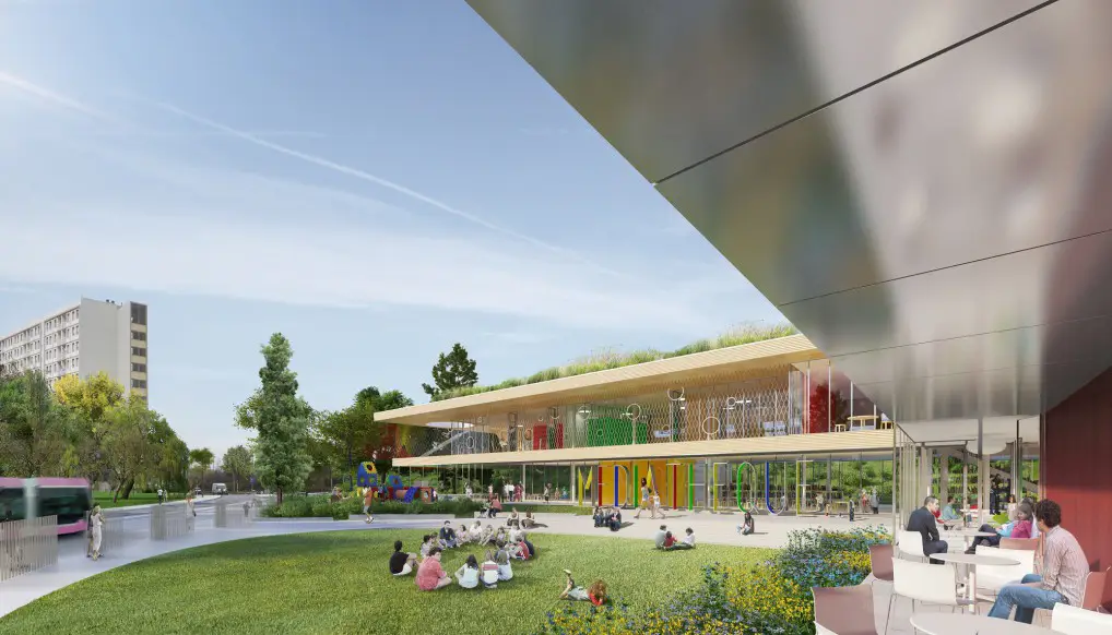 Dessiné par le cabinet Ropa-Architecture, le bâtiment, d’une surface de 2446 m2, se distingue par son ouverture architecturale sur le quartier, la visibilité de ses activités grâce aux parois vitrées, sa façade avec inclinaison acoustique, sans oublier son parvis accessible à toutes et tous. Le toit terrasse doté d’un jardin expérimental mais aussi le cube rouge abritant une salle de spectacle, finissent de signer l’originalité visuelle de la structure. Autre caractéristique, sa Certification en Haute Qualité Environnementale (HQE), qui la place dans une démarche de développement durable.