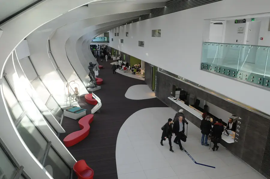 Tout est mis en œuvre pour que l’établissement soit le plus agréable possible pour les patients et les visiteurs : décoration, luminosité, musique... Pour les formations, les exposés et les informations, un amphithéâtre de 84 places est disponible à côté de la salle du conseil d'administration. Le restaurant du personnel propose 200 places et une terrasse abritée par un mur végétalisé. L'hôpital dispose également de 608 places de parking pour le personnel et les visiteurs.A l'agenda Tout voir