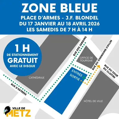 Du 17 janvier au 18 avril, la place d'Armes accueille une zone bleue proposant un stationnement gratuit et limité à 1 heure les samedis de 7h à 14h.
