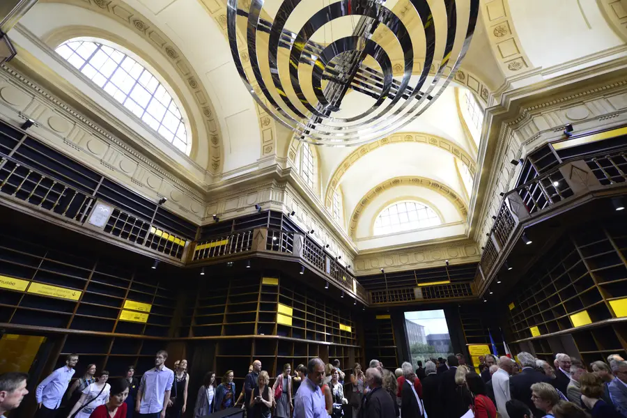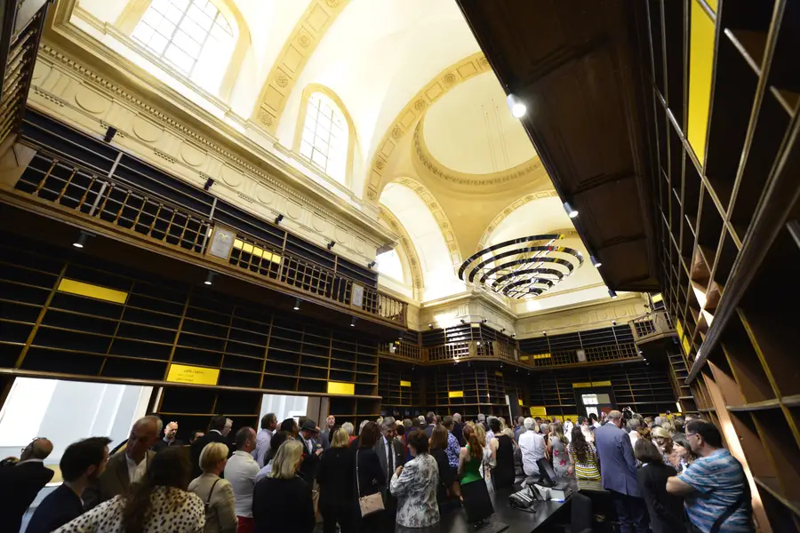 Agrandi, le hall est éclairé par un lustre en forme de spirale ; un escalier hélicoïdal permet d'accéder à l'étage supérieur de la chapelle depuis l'entrée, rue du Haut-Poirier ; on y trouve l'accueil, la billetterie, la boutique du musée et un espace café. Les rayonnages de l'ancienne bibliothèque ont été conservés.